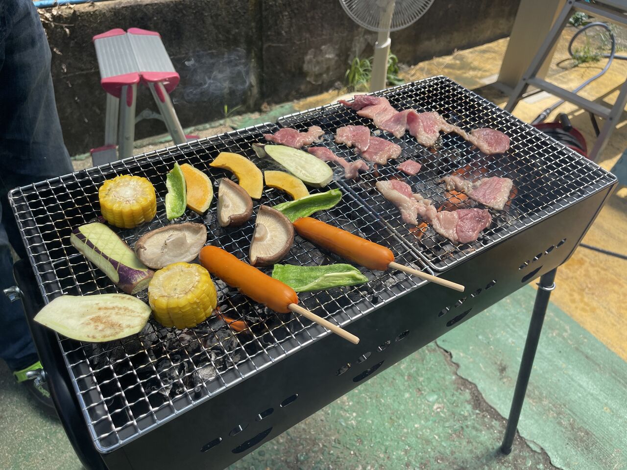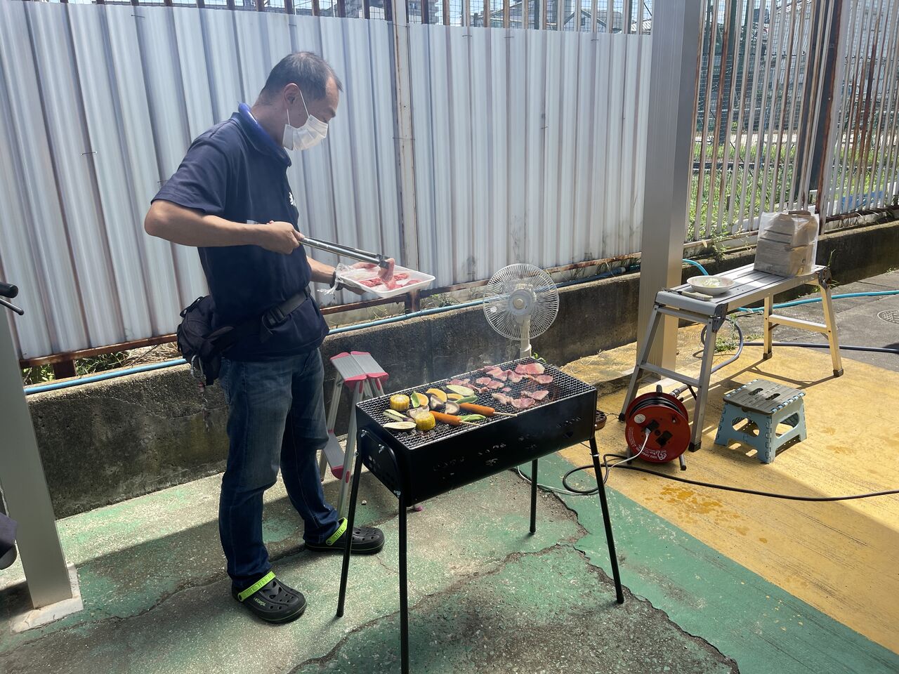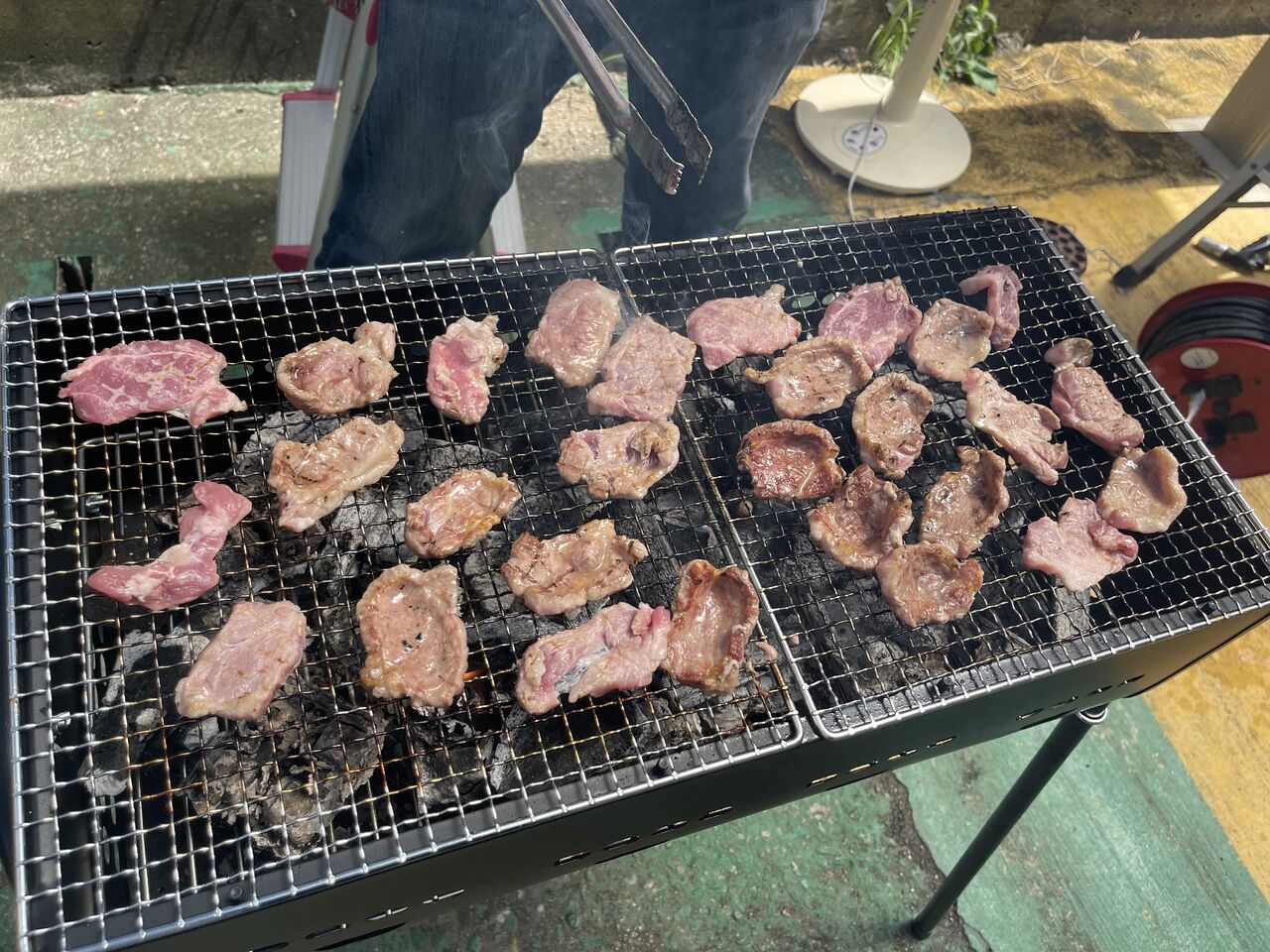 駐車場ではバーベキュー。