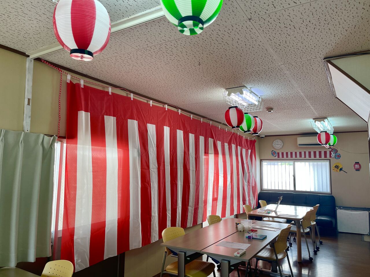 紅白の幕と提灯を付けると